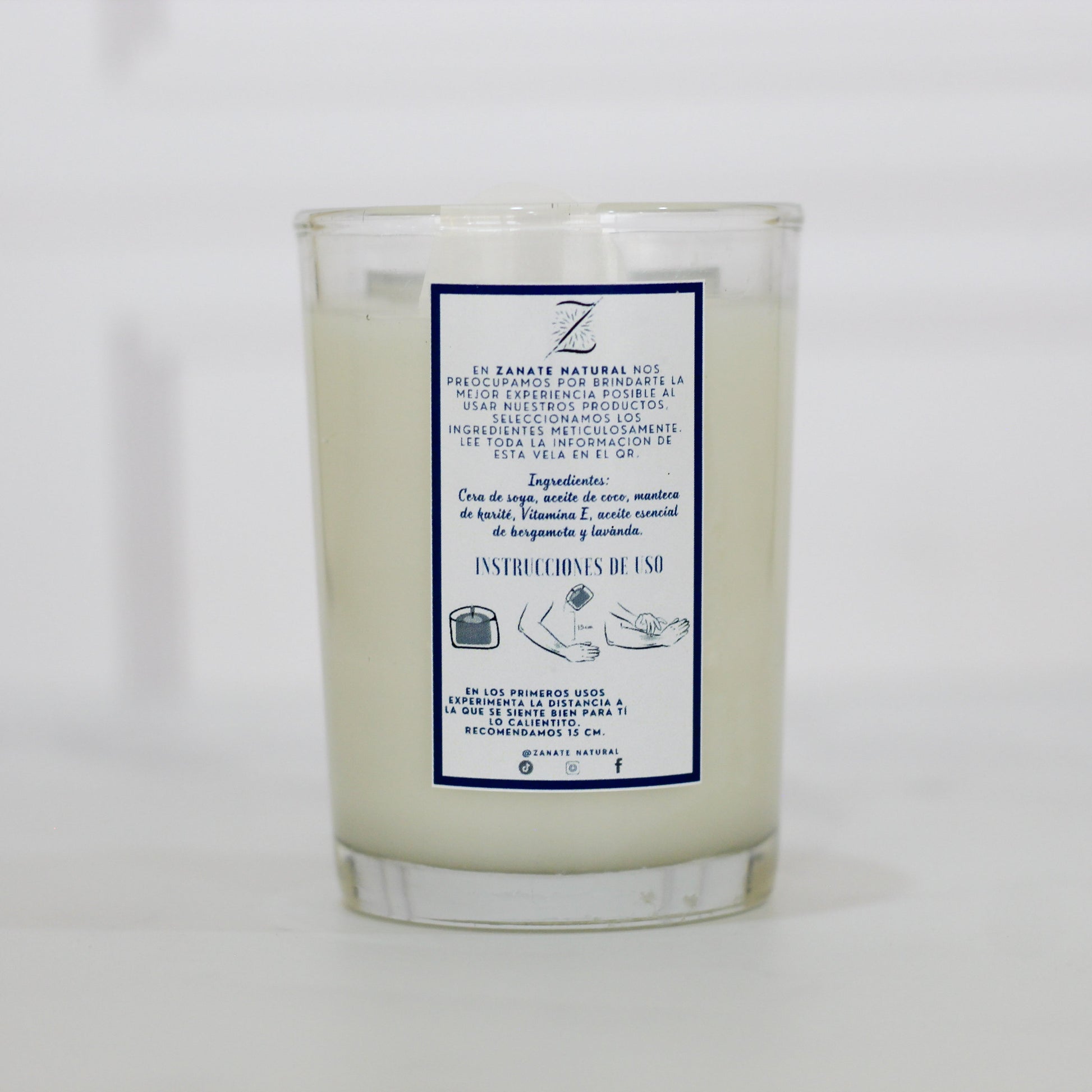 Ingredientes : Cera de soja, aceite de coco, manteca de karité, Vitamina E, aceite esencial de bergamota (Citrus bergamia) y lavanda (Lavandula angustifolia).
