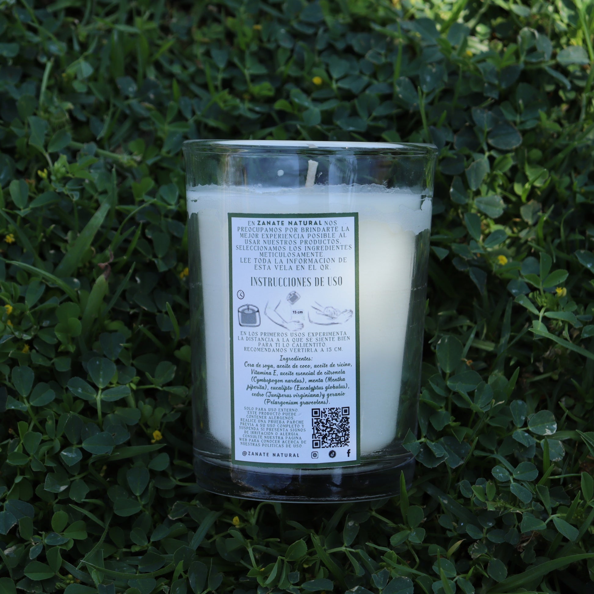 Ingredientes : Cera de soja, aceite de coco, aceite de ricino, Vitamina E, aceite esencial de citronela (Cymbopogon nardus), menta (Mentha piperita), eucalipto (Eucalyptus globulus), cedro (Juniperus virginiana) y geranio (Pelargonium graveolens).